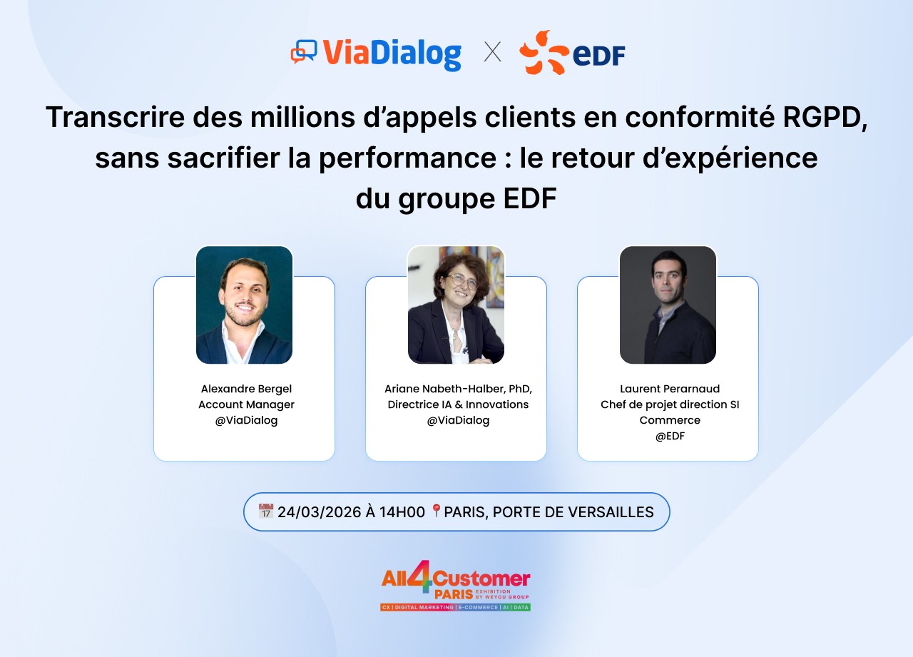 Transcrire, analyser et valoriser des millions d’interactions vocales représente un défi technique, organisationnel et réglementaire majeur. Lors de cette masterclass organisée dans le cadre de All4Customer 2026, EDF et ViaDialog dévoilent les choix d’architecture, les mécanismes de désidentification et les arbitrages de performance qui ont permis de concilier volumétrie industrielle et conformité stricte au RGPD.