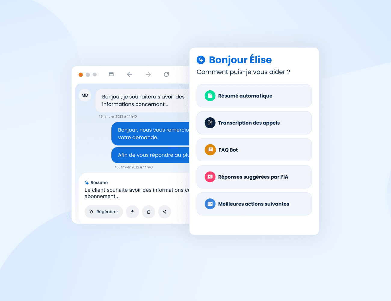 L'assistance intelligente révolutionne le métier d'agent. Grâce à l'IA générative, vos conseillers bénéficient de suggestions de réponses en direct pendant leurs échanges. Le système analyse la conversation en temps réel, propose les arguments adaptés et génère automatiquement un résumé complet dès la fin de l'appel.